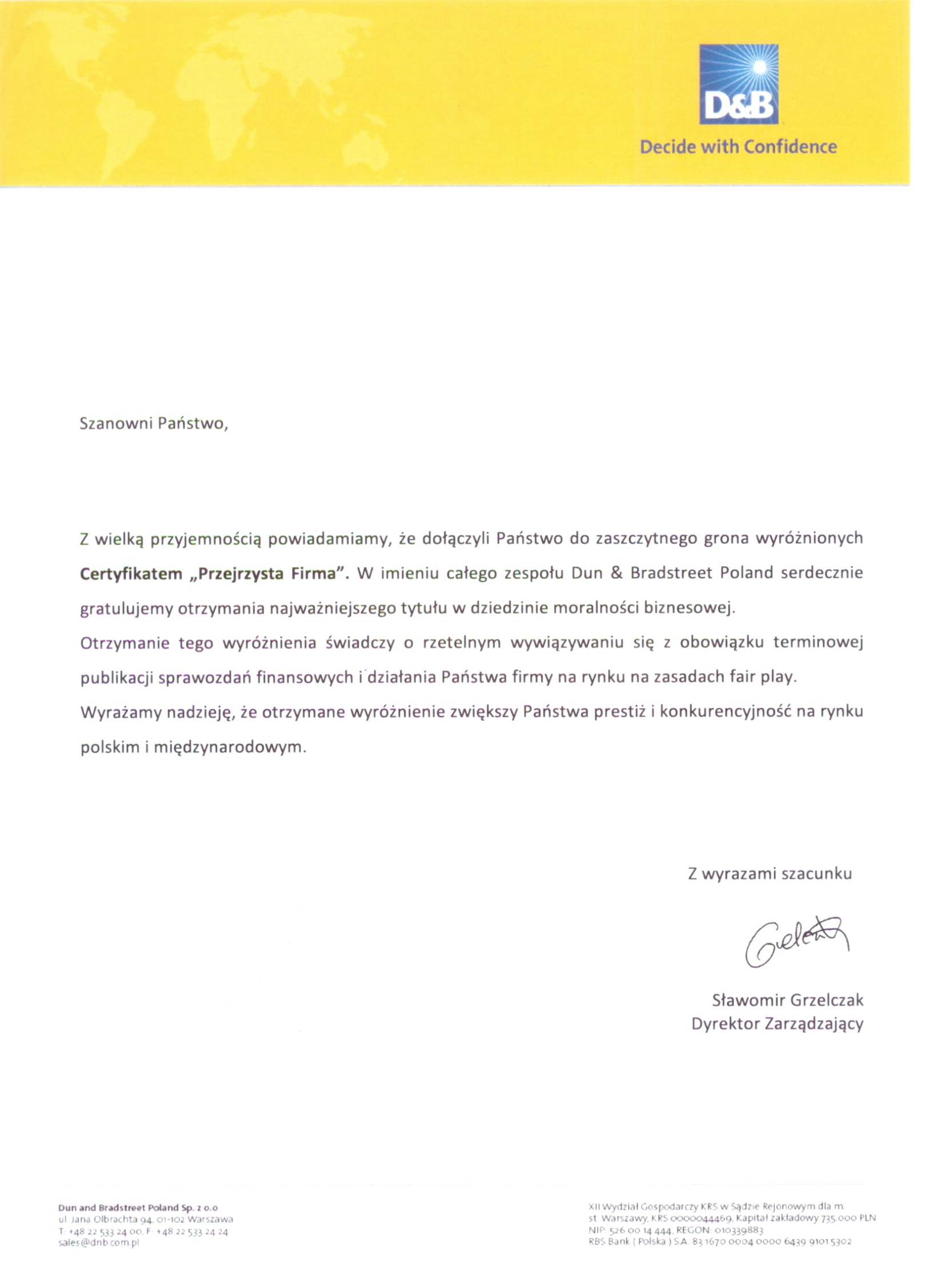 Firma Decus Druk zdobyła Certyfikat „Przejrzysta Firma” nadany przez Dun&Bradstreet. Otrzymanie tego wyróżnienia świadczy o rzetelnym wywiązywaniu się z obowiązków terminowej publikacji sprawozdań finansowych i działania naszej firmy na rynku na zasadach fair play.